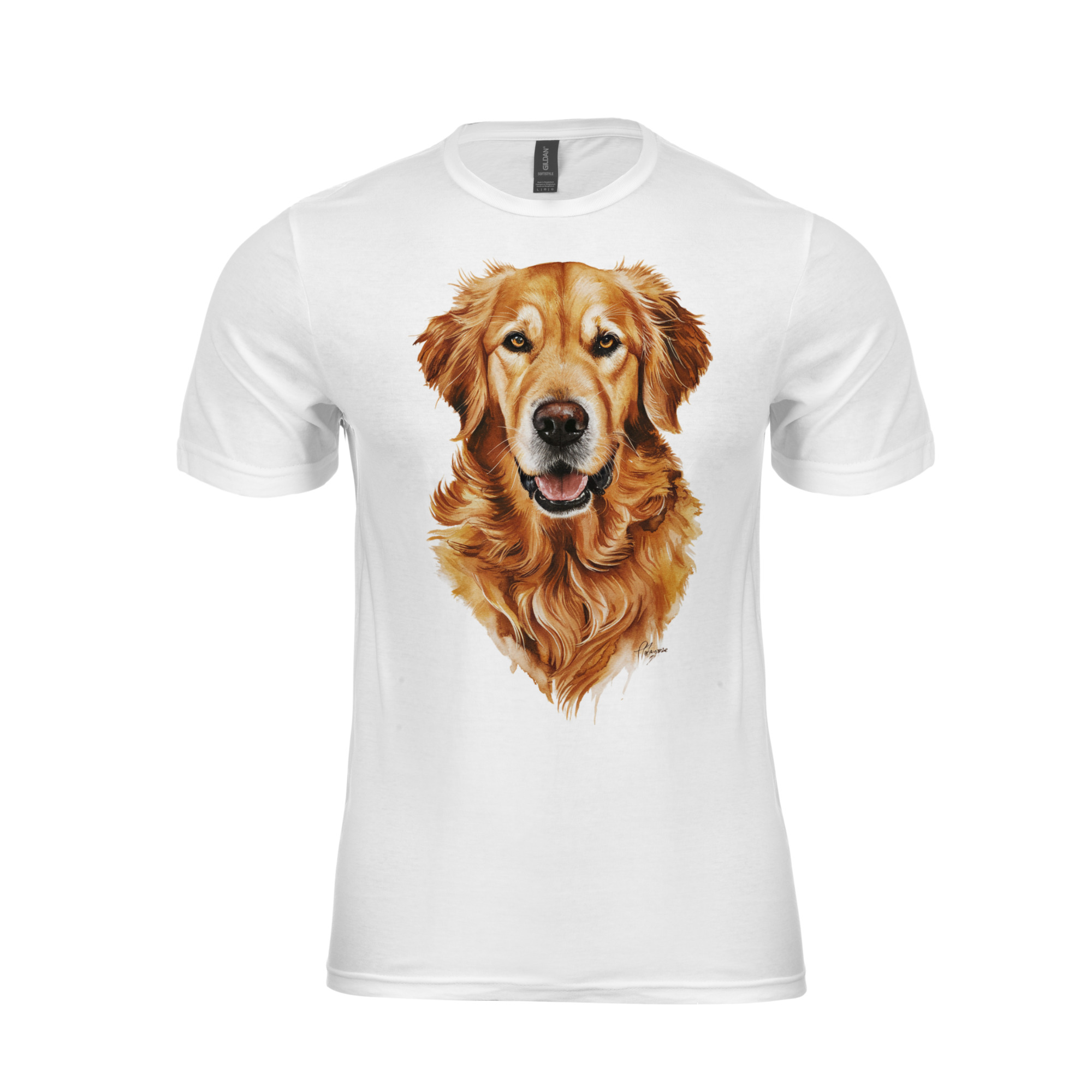 Ta koszulka to idealny wybór dla każdego, kto kocha przyjazne i pełne serca Golden Retrievery. Realistyczny nadruk ukazuje ich wyjątkowy urok, inteligencję i pogodny charakter – dokładnie to, za co miliony ludzi uwielbiają tę rasę.