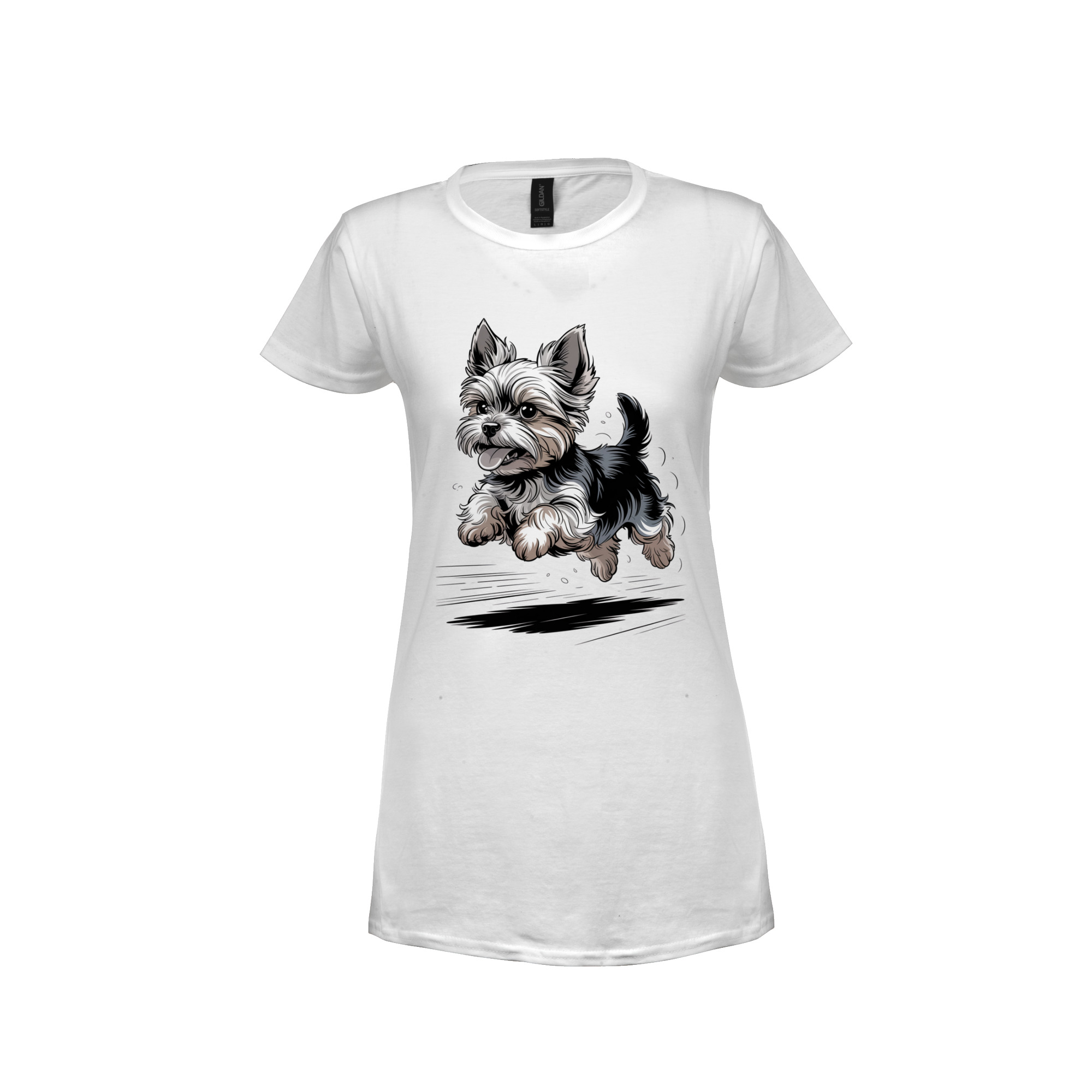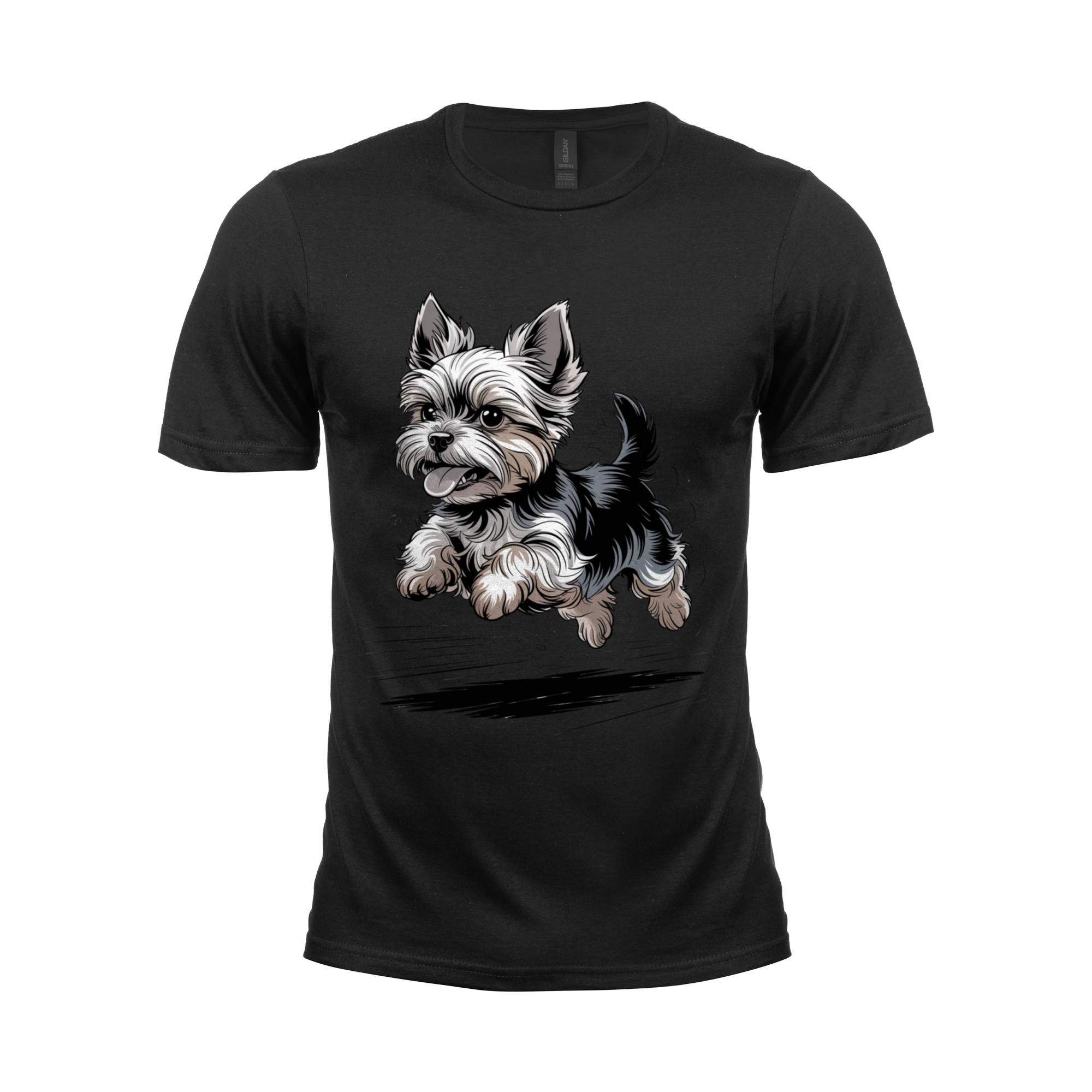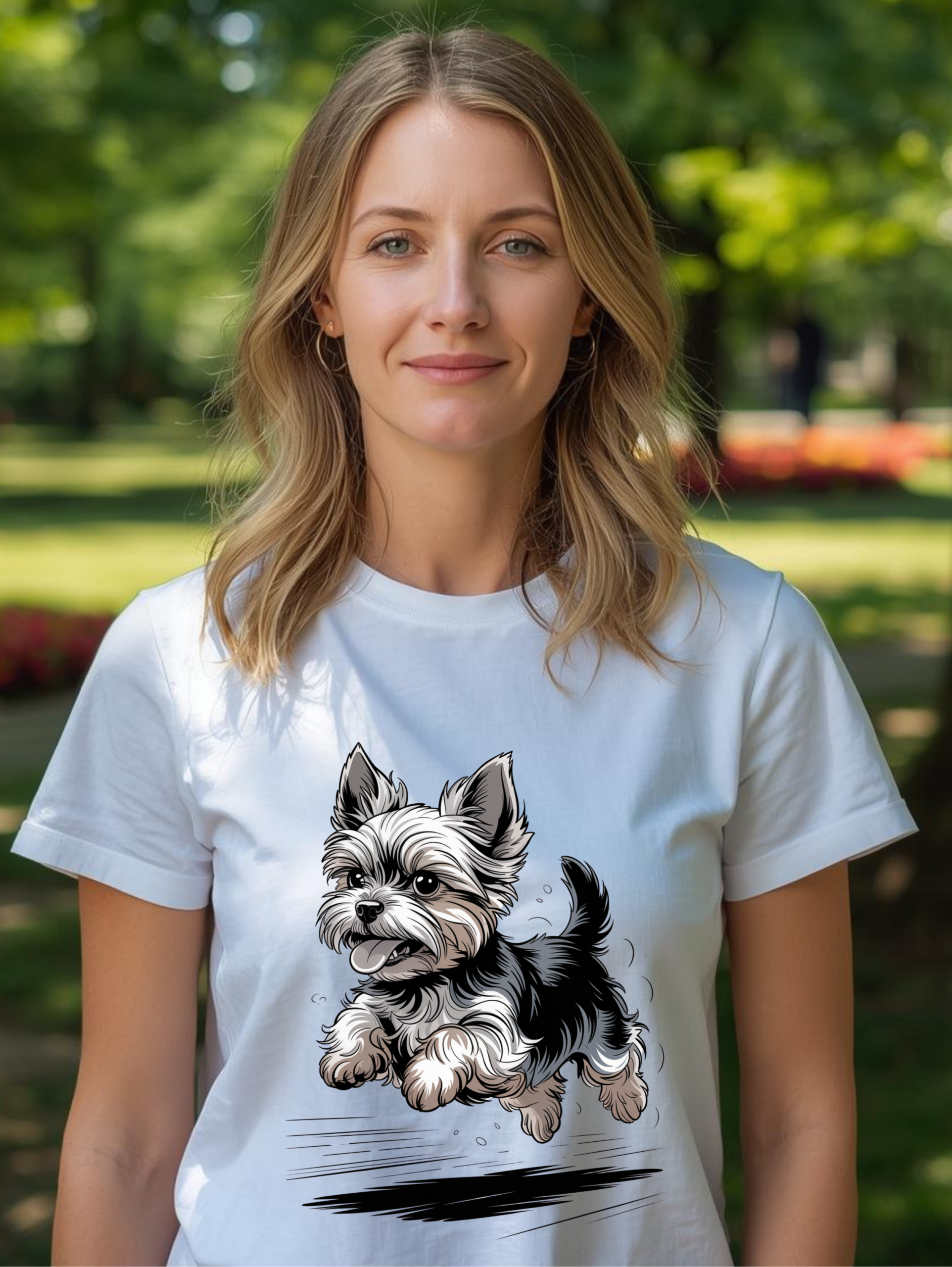 Stylowa i pełna energii – ta koszulka T-shirt w kolorze czarnym lub białym to propozycja dla osób, które cenią sobie dynamikę i pozytywne emocje. Wyrazista grafika biegnącego Yorka nadaje projektowi lekkości, radości i podkreśla miłość do psów oraz aktywnego stylu życia.