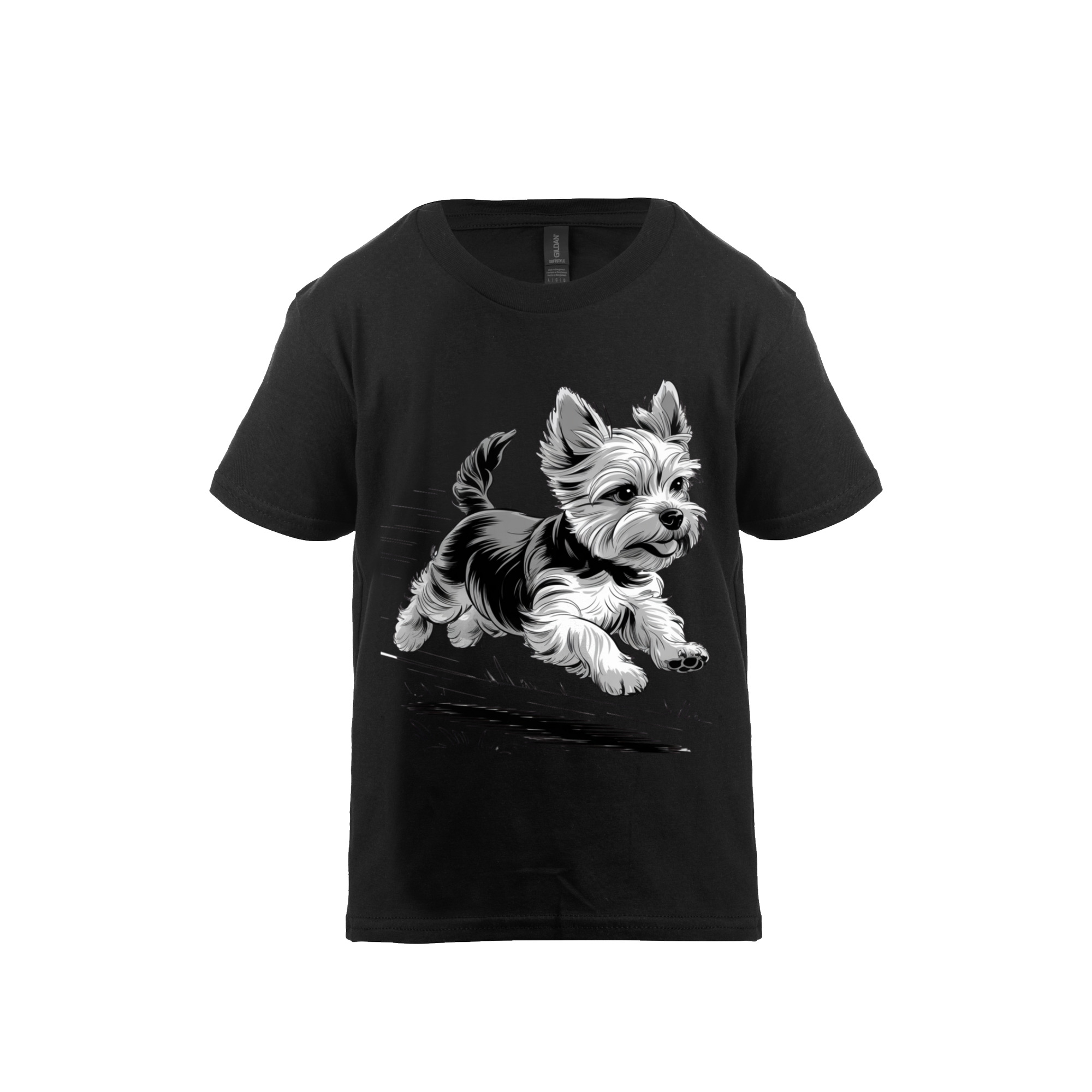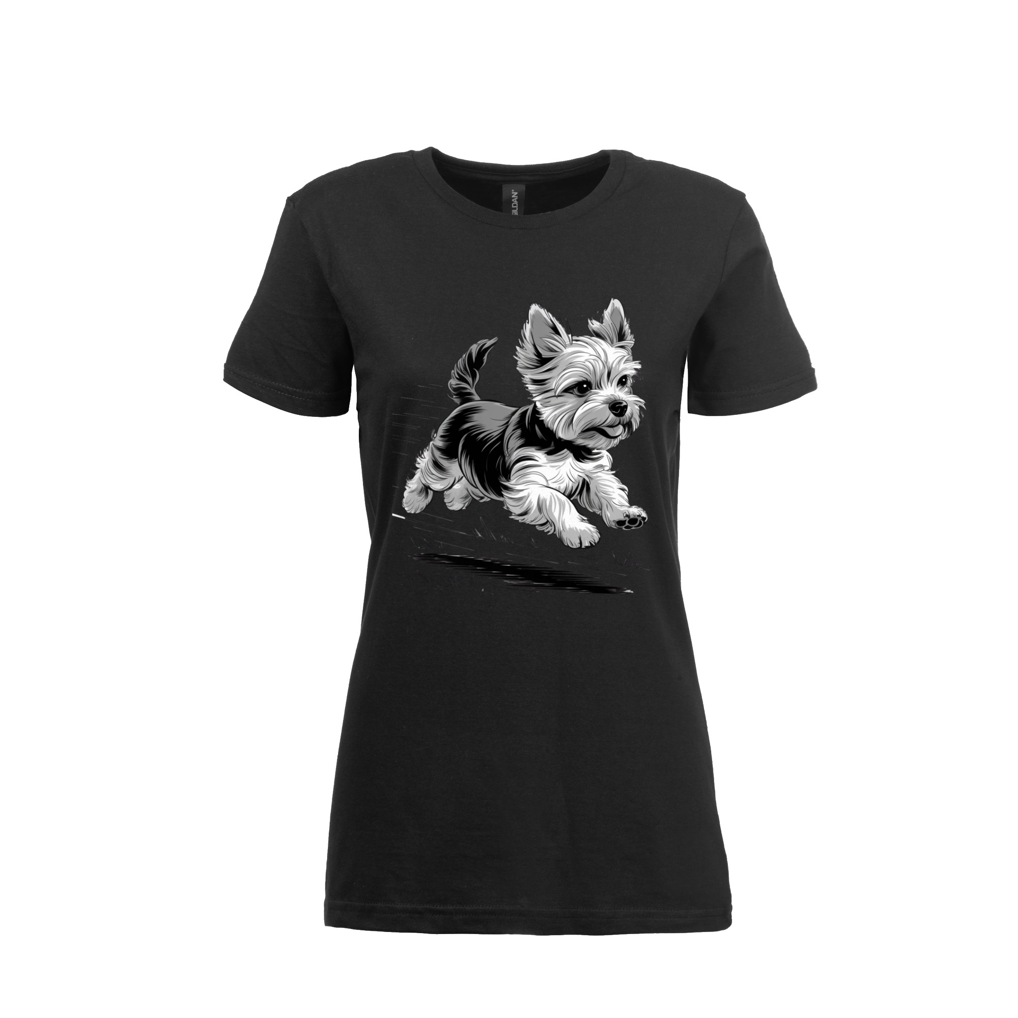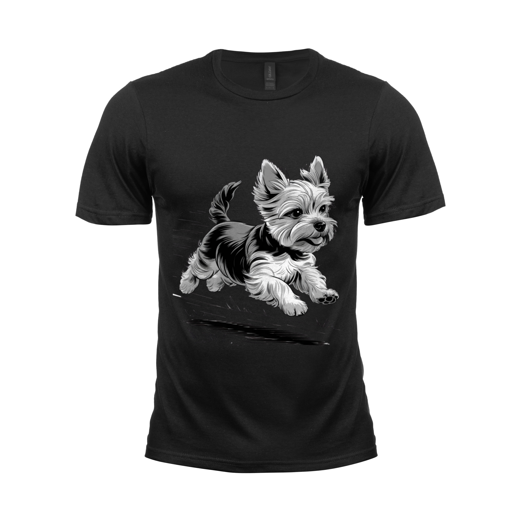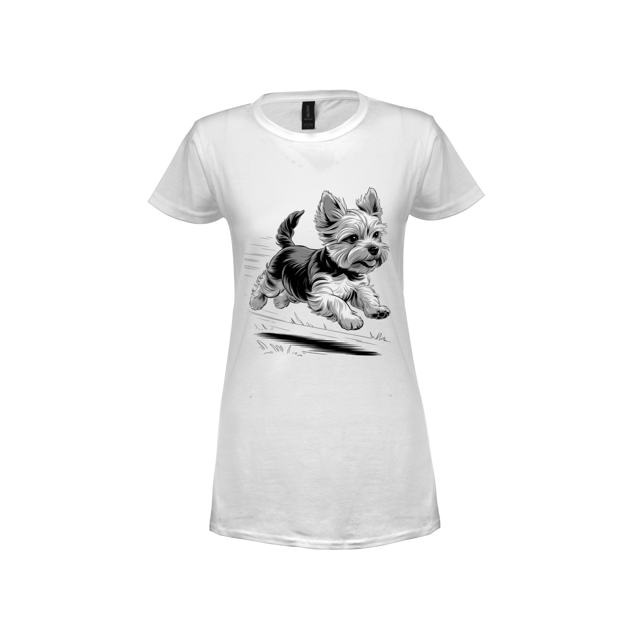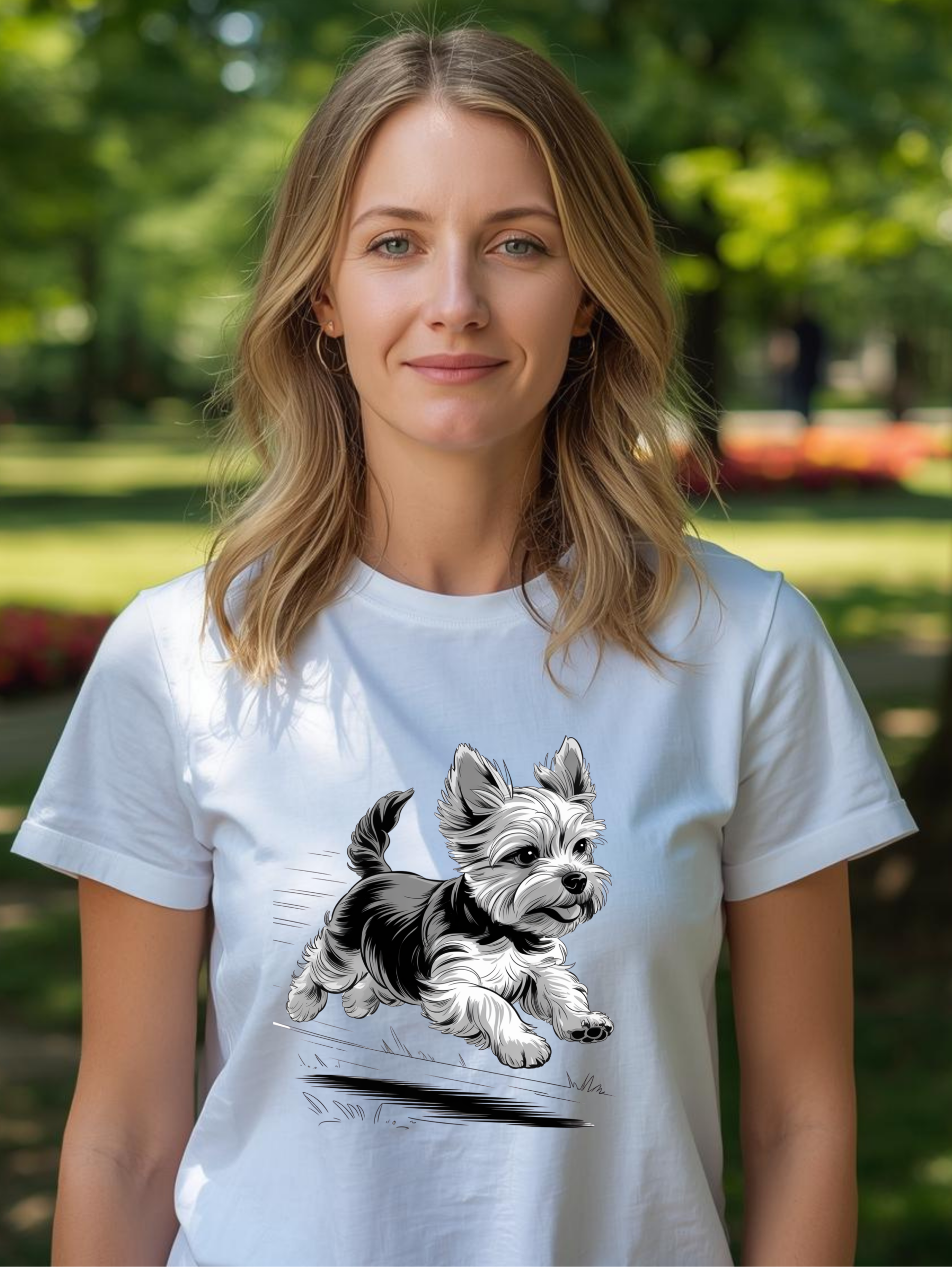 Stylowa i pełna energii – ta koszulka T-shirt w kolorze czarnym lub białym to propozycja dla osób, które cenią sobie dynamikę i pozytywne emocje. Wyrazista grafika biegnącego Yorka nadaje projektowi lekkości, radości i podkreśla miłość do psów oraz aktywnego stylu życia.