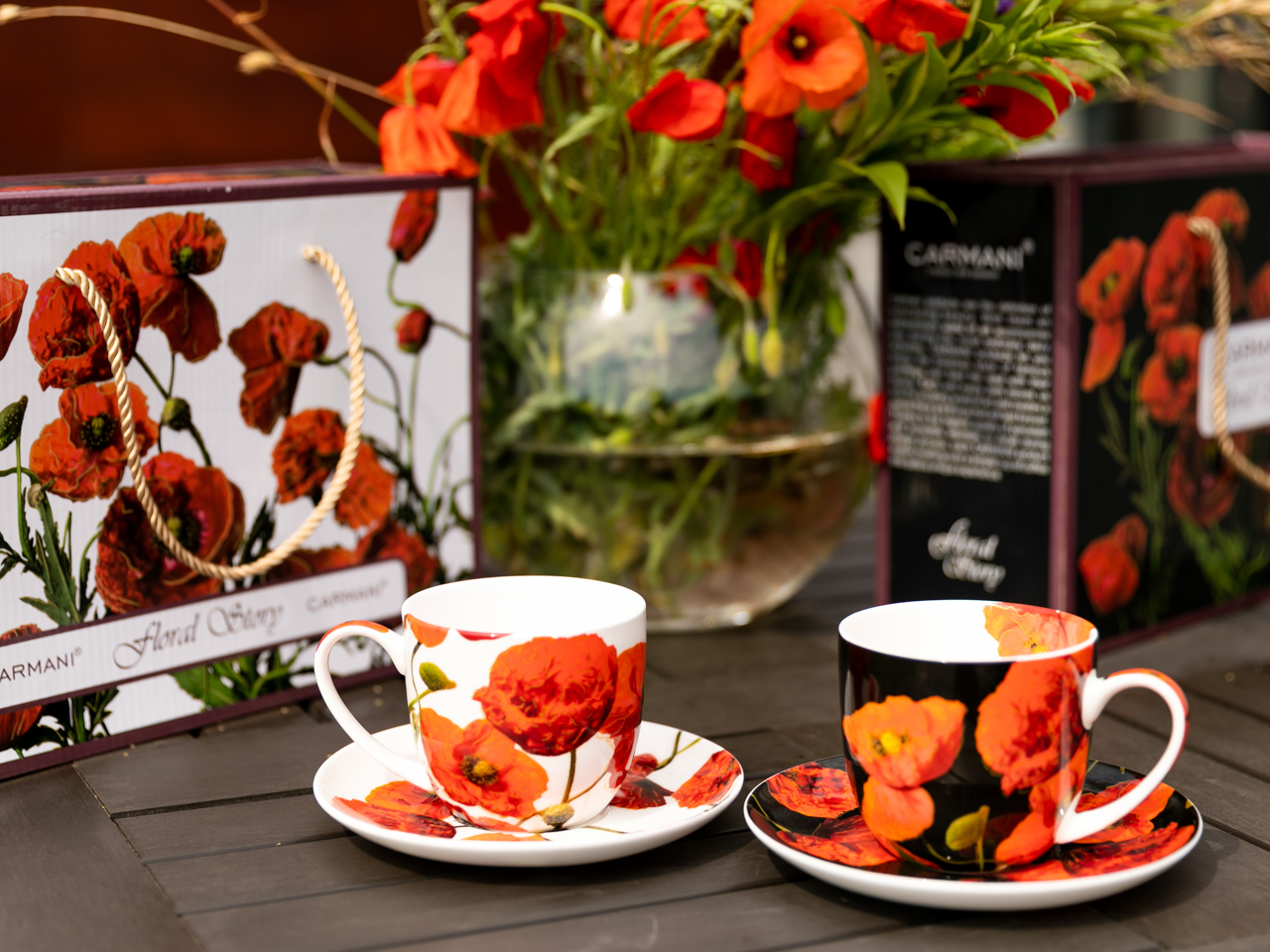 Zestaw dwóch filiżanek ze spodkami ozdobionych makami polnymi ale każdy na innym tle. Filiżanki zostały zapakowane w wysokiej jakości pudełko – kuferek, co dodatkowo zwiększa prestiż produktu.