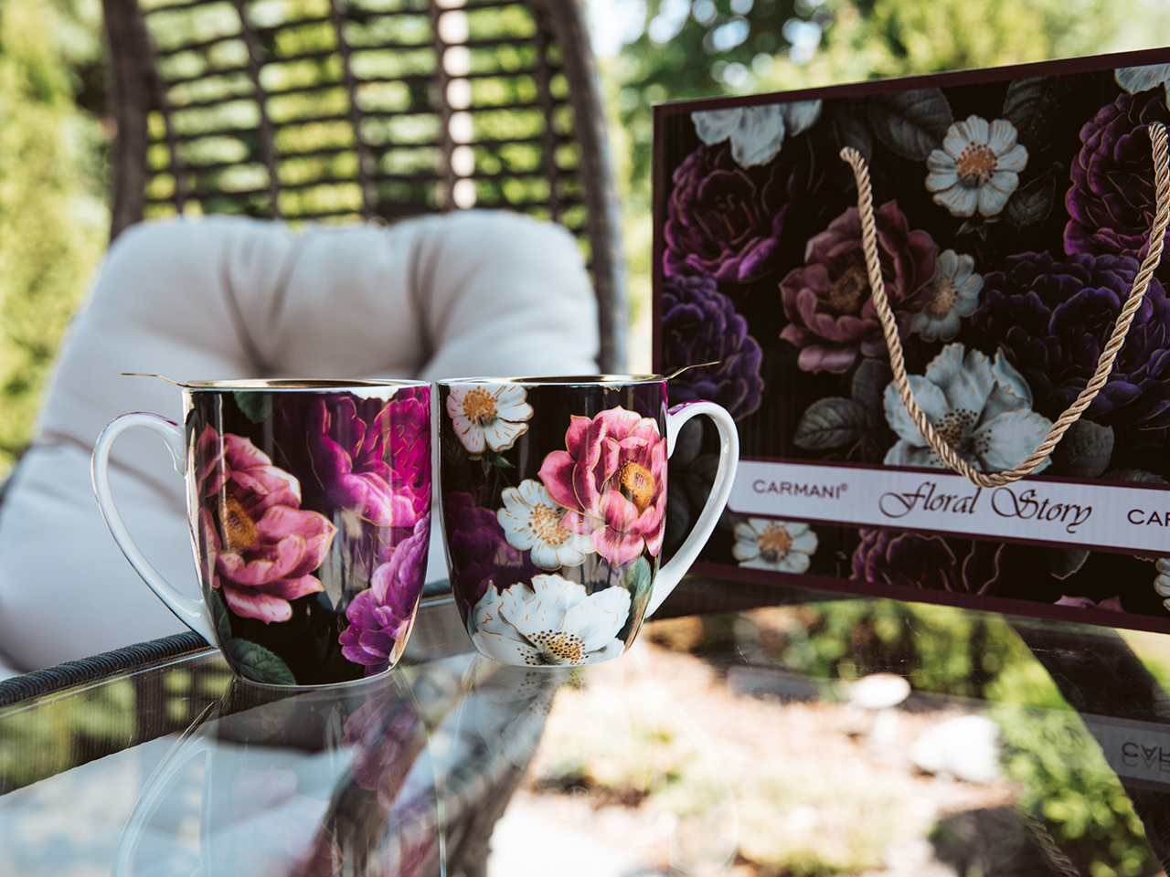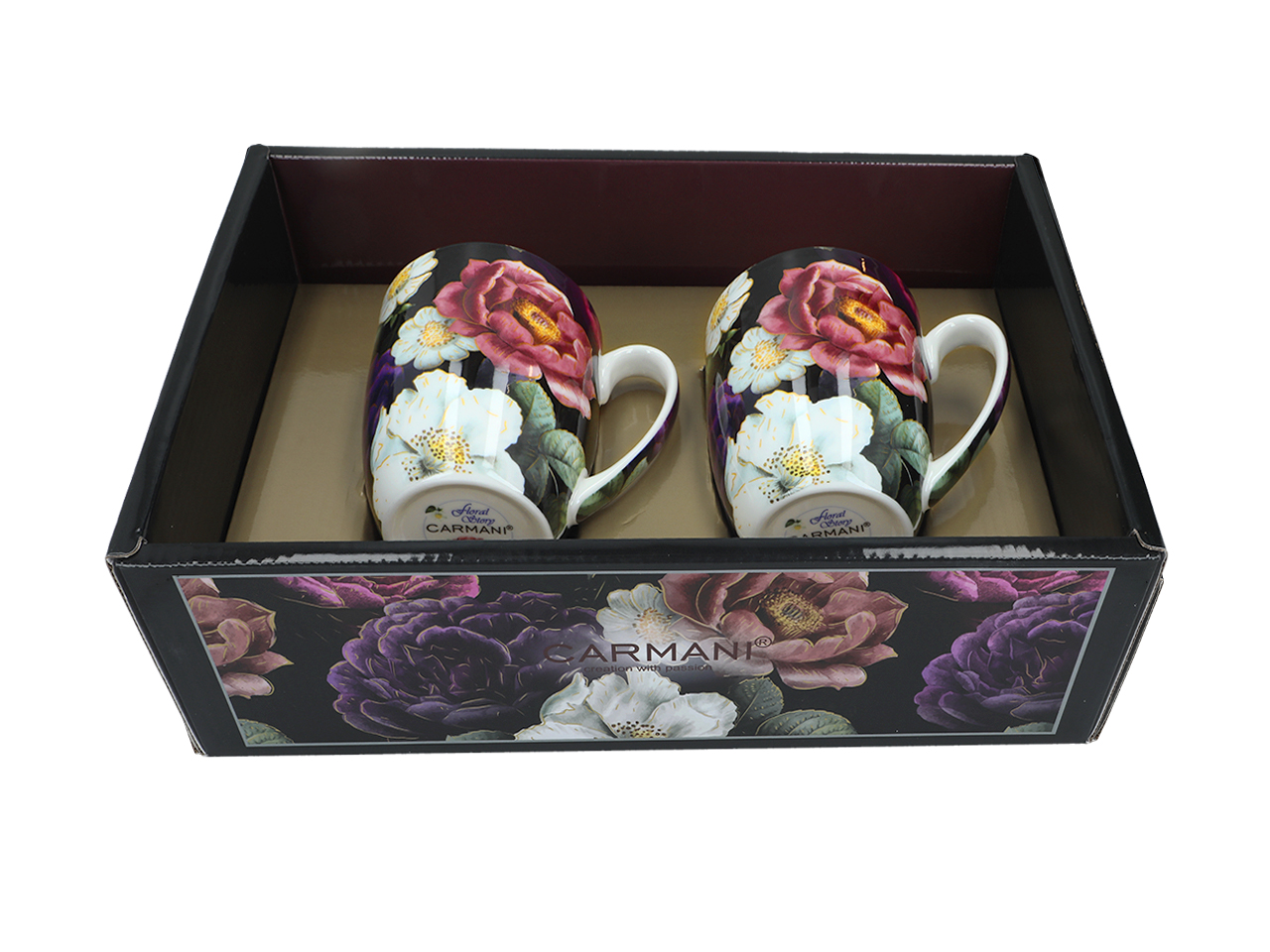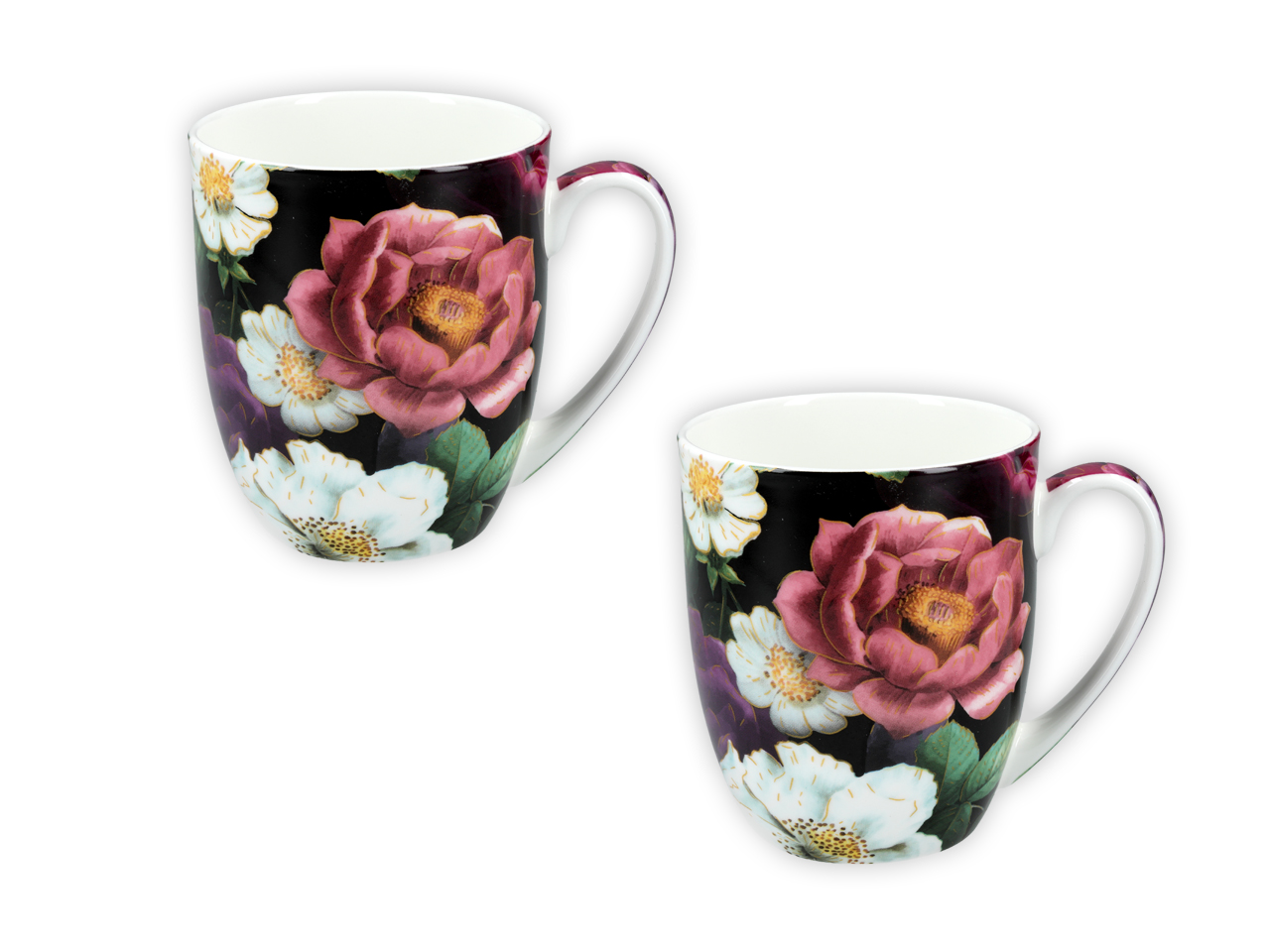 Zestaw dwóch eleganckich kubków ozdobionych efektowną kompozycją kwiatów na czarnym tle. Kubki zostały zapakowane w wysokiej jakości pudełko – kuferek, co dodatkowo zwiększa prestiż produktu.