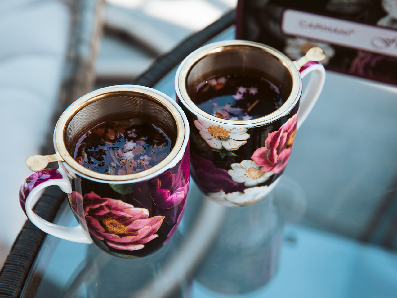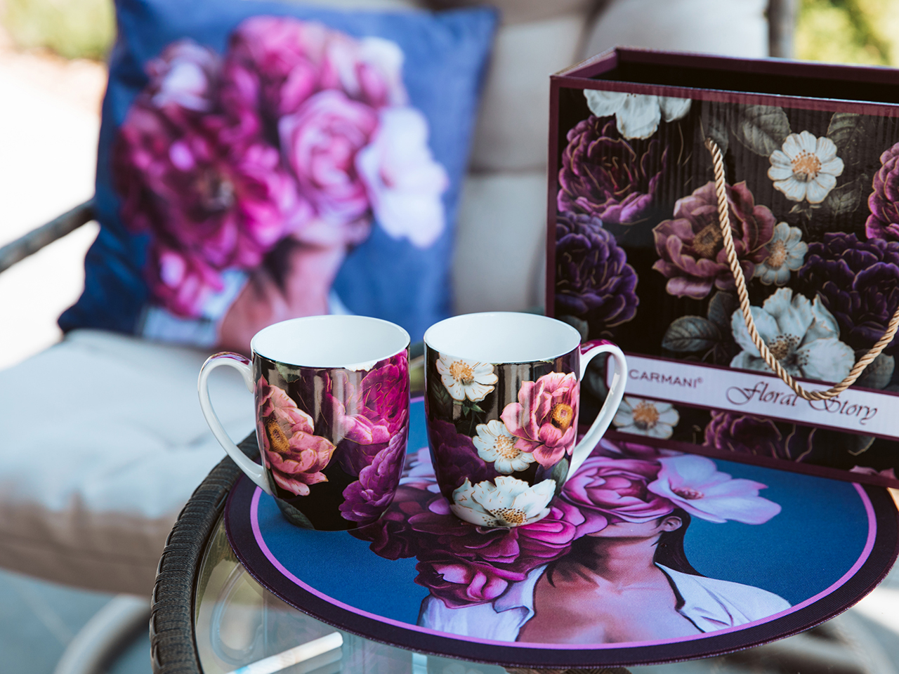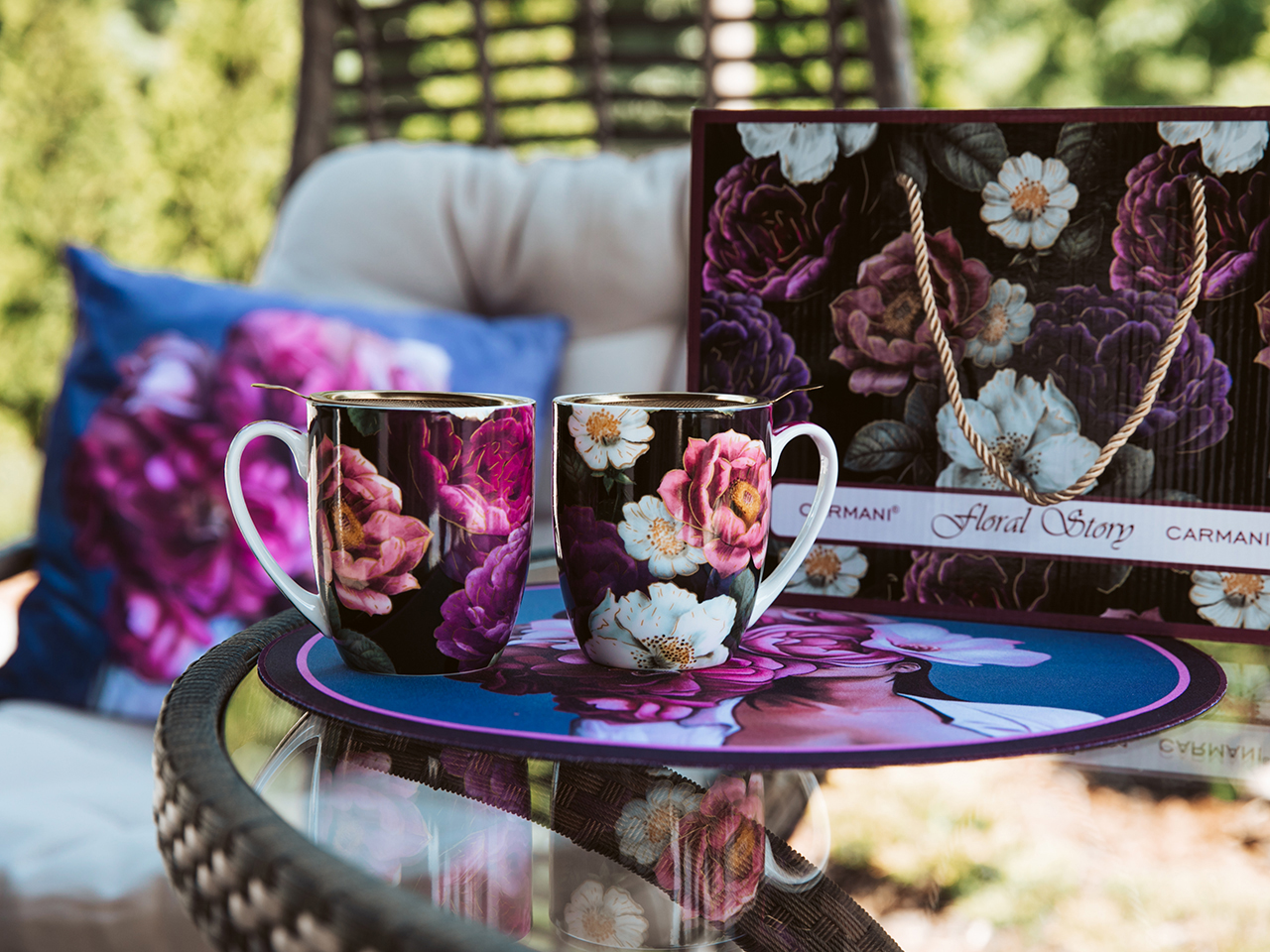 Zestaw dwóch eleganckich kubków ozdobionych efektowną kompozycją kwiatów na czarnym tle. Kubki zostały zapakowane w wysokiej jakości pudełko – kuferek, co dodatkowo zwiększa prestiż produktu.