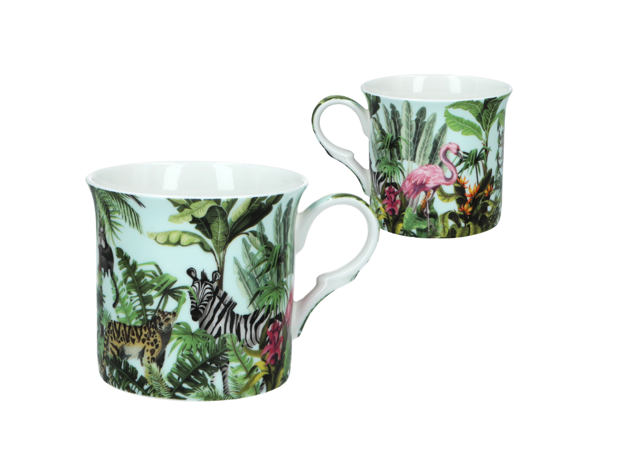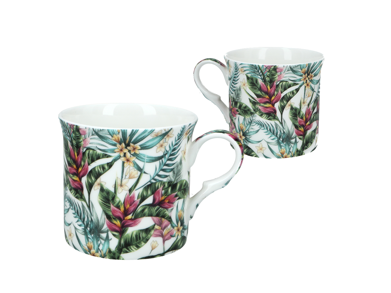 Komplet składa się z czterech kubków wykonanych z wysokiej jakości porcelany. Każdy z kubków ozdobiony jest tropikalnym motywem, przedstawiającym egzotyczne rośliny i zwierzęta.