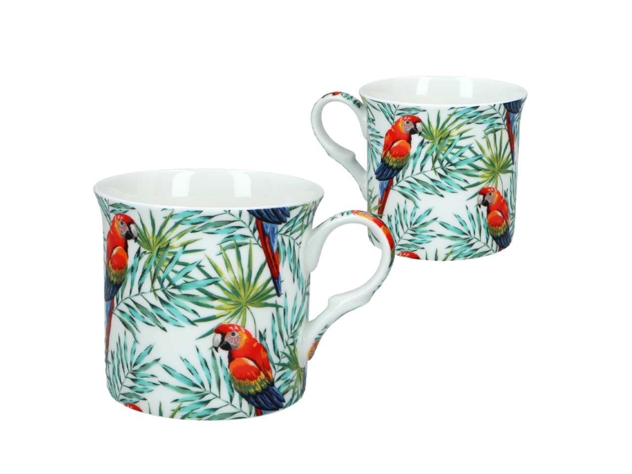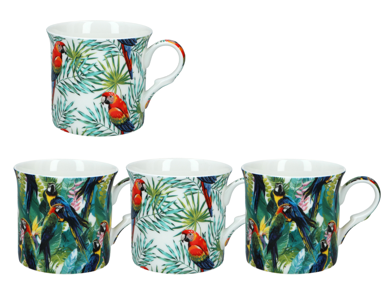 Komplet składa się z czterech kubków wykonanych z wysokiej jakości porcelany. Każdy z kubków ozdobiony jest tropikalnym motywem, przedstawiającym egzotyczne rośliny i zwierzęta.