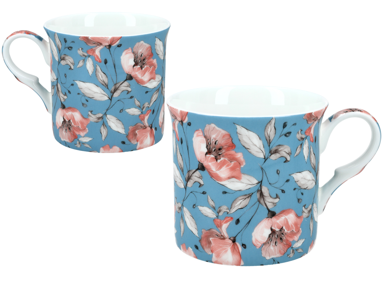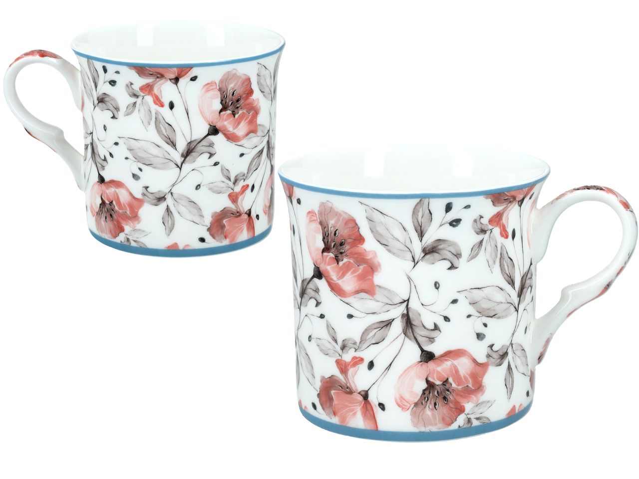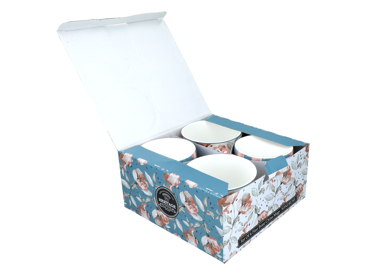 Zestaw czterech porcelanowych kubków o pojemności 295ml, każdy z unikalną kwiatową ilustracją. Kubki są trwałe, wygodne i idealne do codziennego użytku.