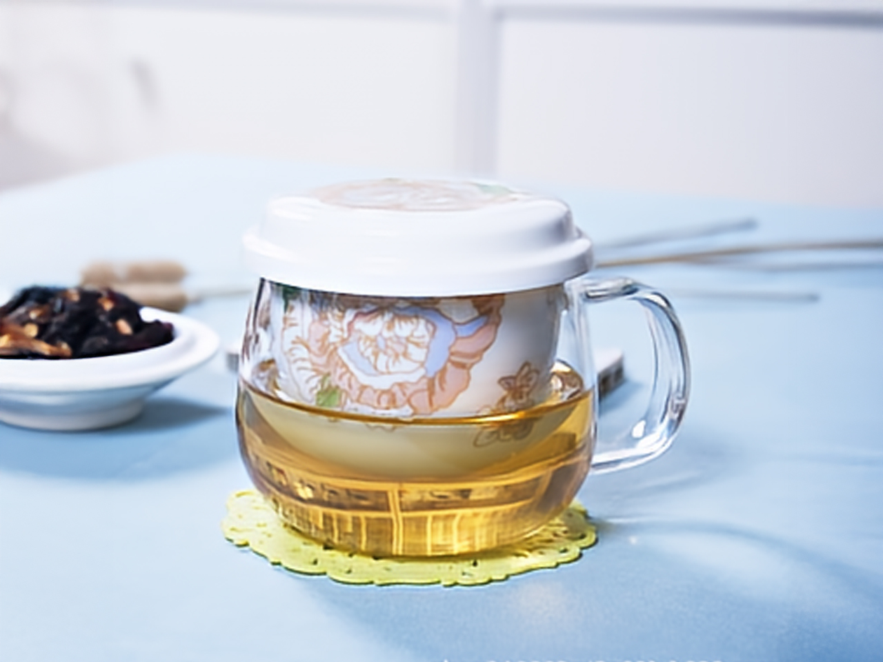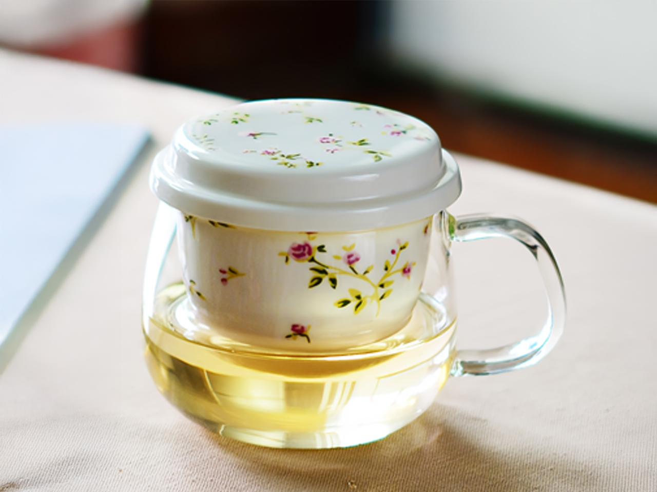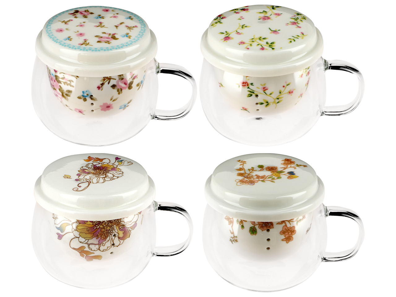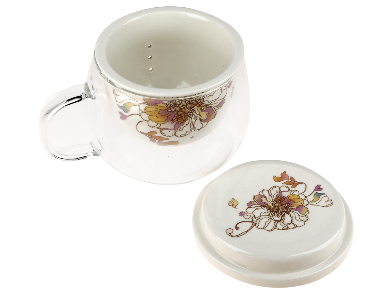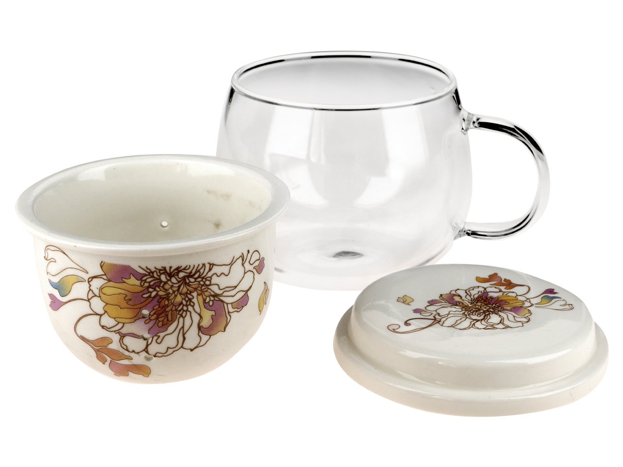 Kubek szklany z ceramicznym zaparzaczem i przykrywką.